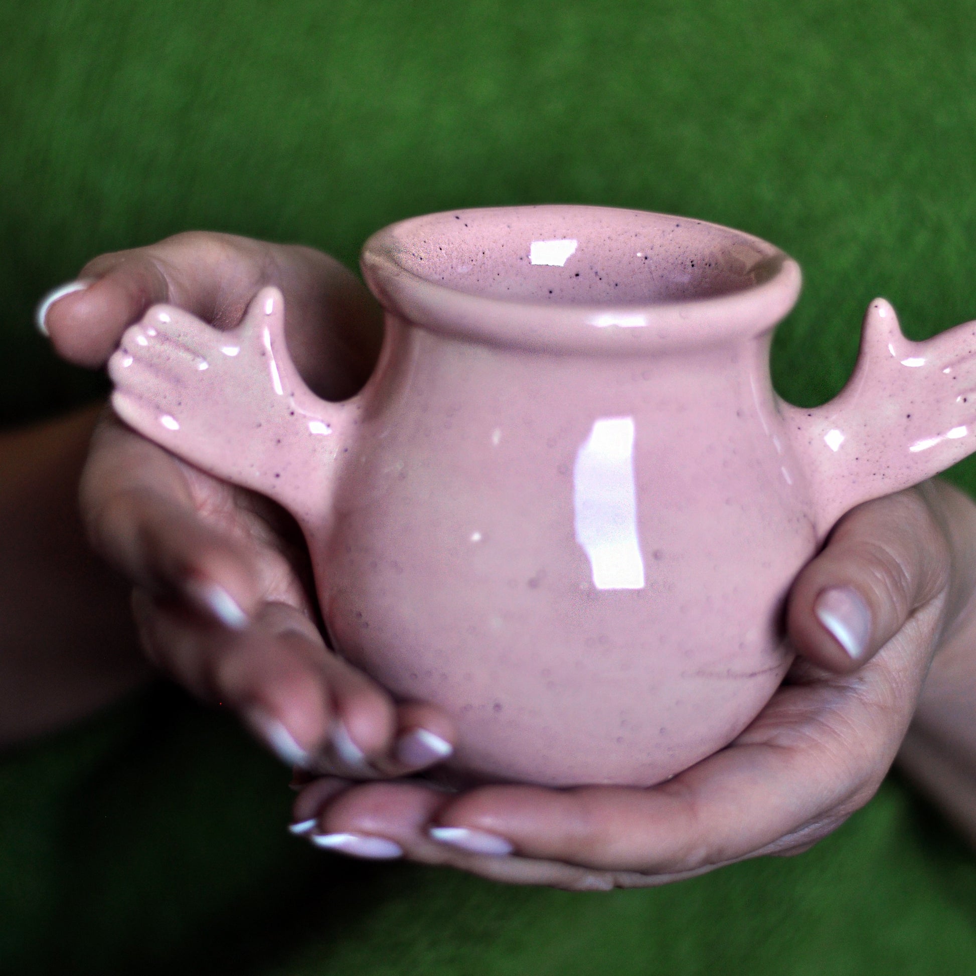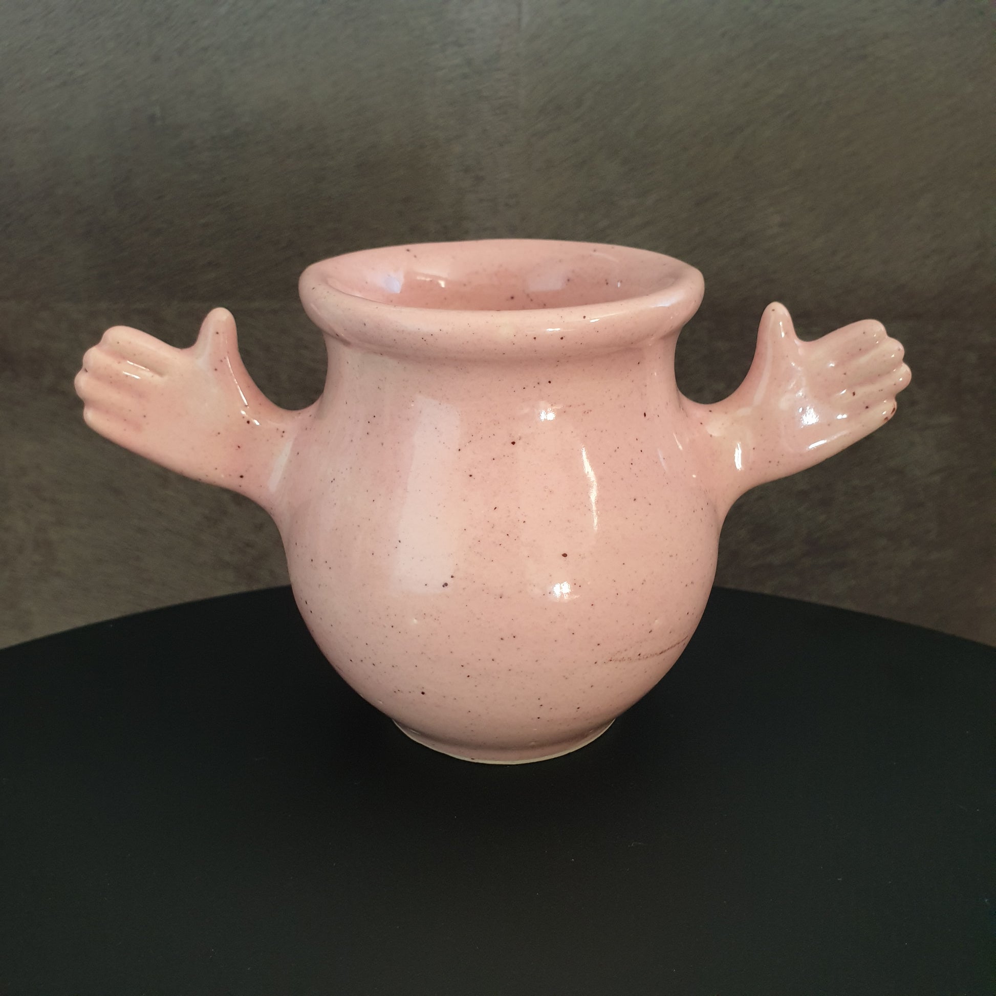 Autorinis rankų darbo indas. Baltas šamotinis molis, blizgi rožinė glazūra.