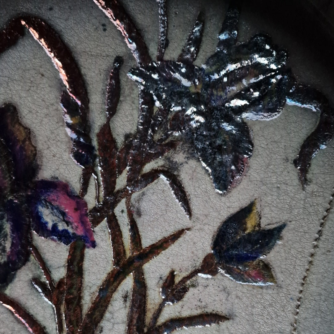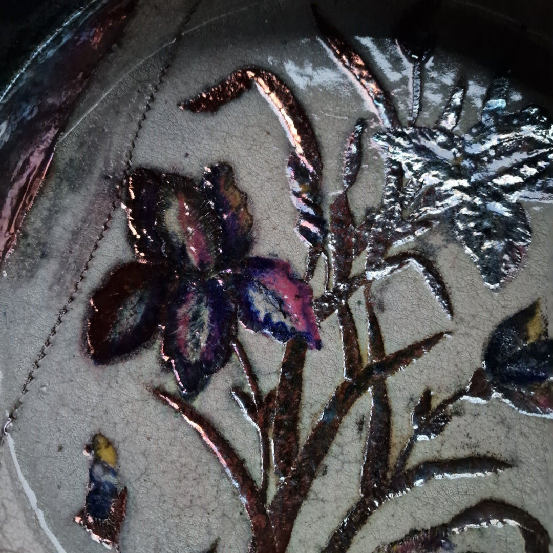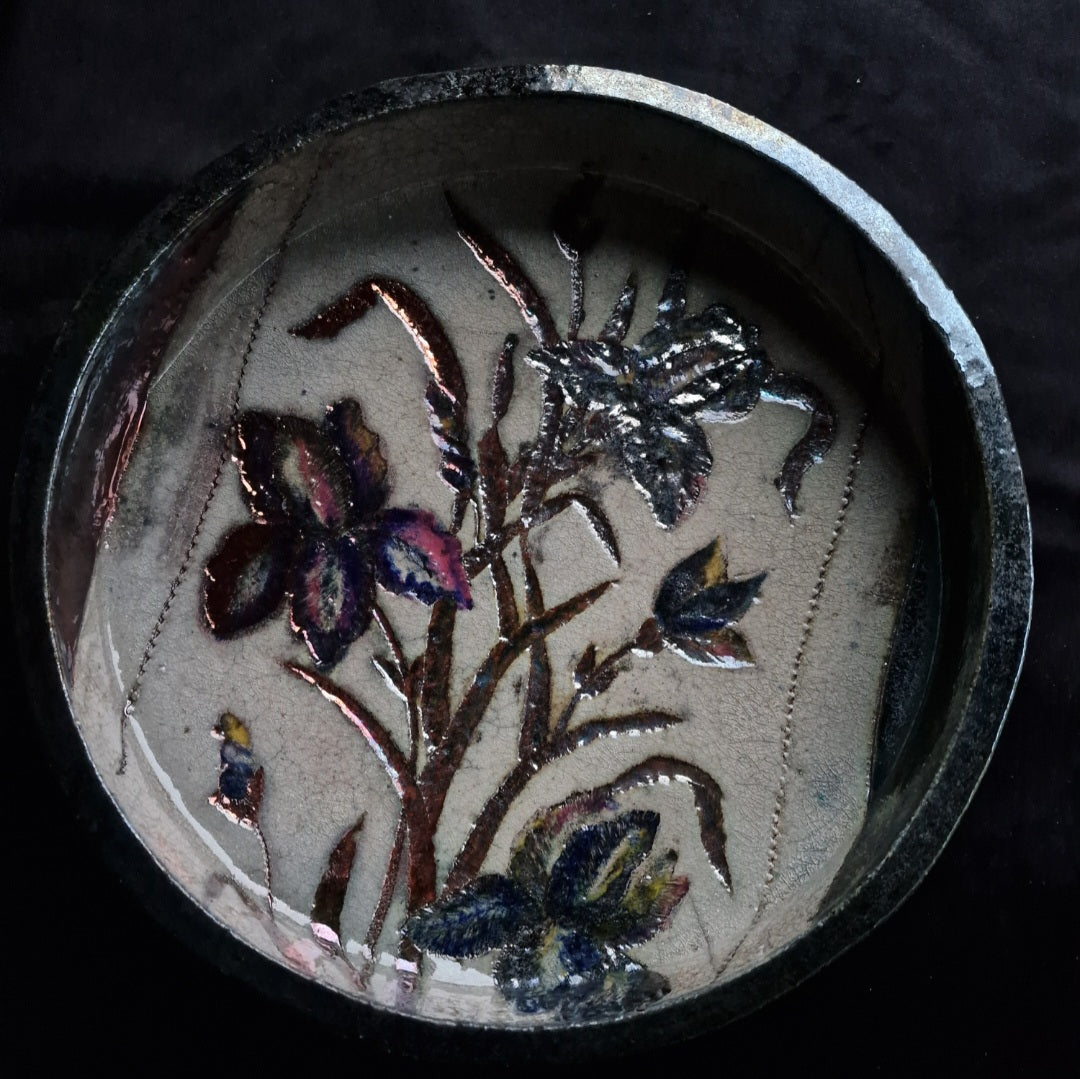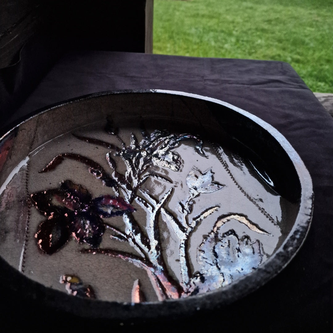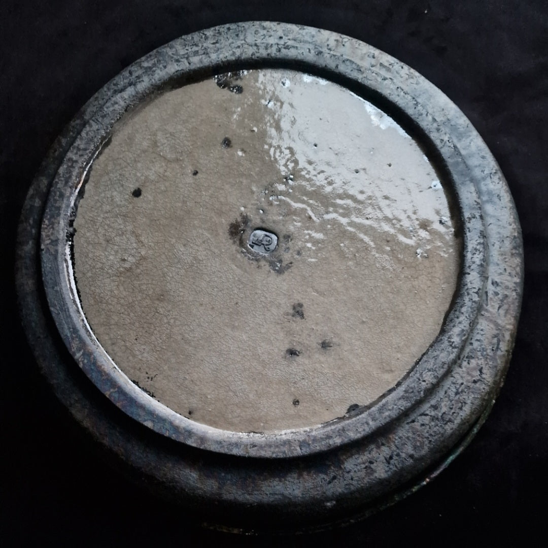 Rankų darbo indas. 31 x 31 x 6 cm. Raku degimo technika