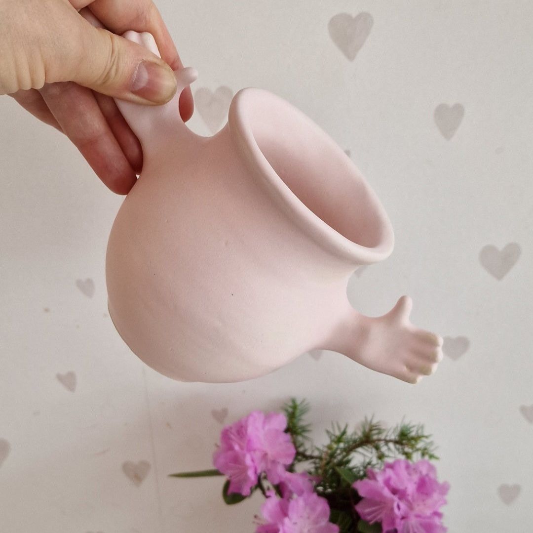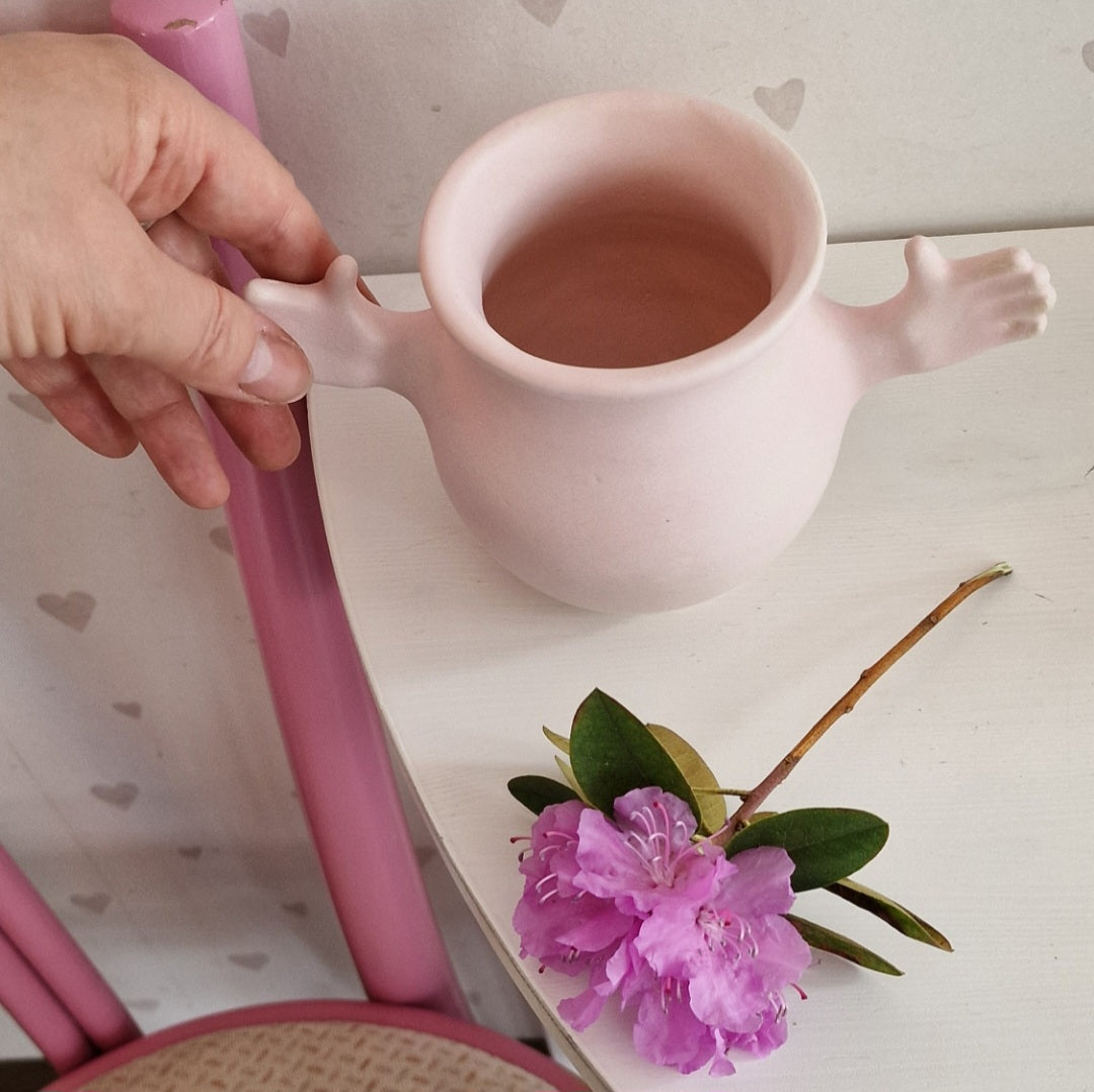 Autorinis rankų darbo indas. Baltas šamotinis molis, blyški rožinė glazūra. Švelnus matinis paviršius, itin mielas liesti. Puikiai dera tarpusavyje su kitais matiniais broliukais ir sesutėm: baltu, pilkšvu, mėtiniu ir ryžių baltumo LABUKAIS.